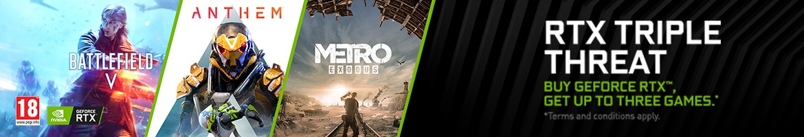 I en begrenset periode får du Battlefield V, Anthem og Metro med på kjøpet når du kjøper et GeForce RTX-grafikkort eller en spill-PC med et av disse.*