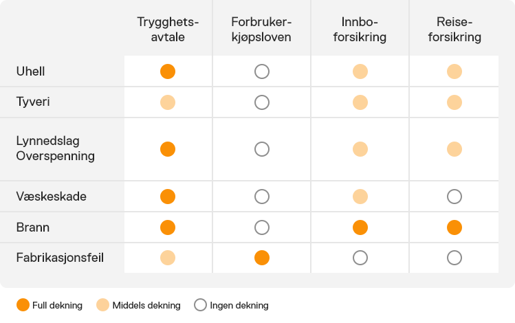 Tabellen til høyre viser sammenhengen mellom ulike forsikringer, og hvilke områder Trygghetsavtalen kan gi deg en god tilleggsdekning på.