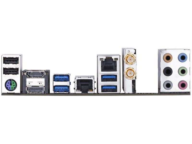 4 x USB 3.1 Gen 1, 1 x lydutlinje (side-surround) - minijakk, 1 x lydinnlinje - minijakk, 2 x USB 2.0, 1 x mikrofon - minijakk, 1 x lydutlinje (bakre) - minijakk, 1 x lydutlinje - minijakk, 2 x LAN (Gigabit Ethernet), 2 x HDMI, 1 x PS/2-tastatur / -mus, 1 x lydutlinje (senter/subbasshøyttaler) - minijakk