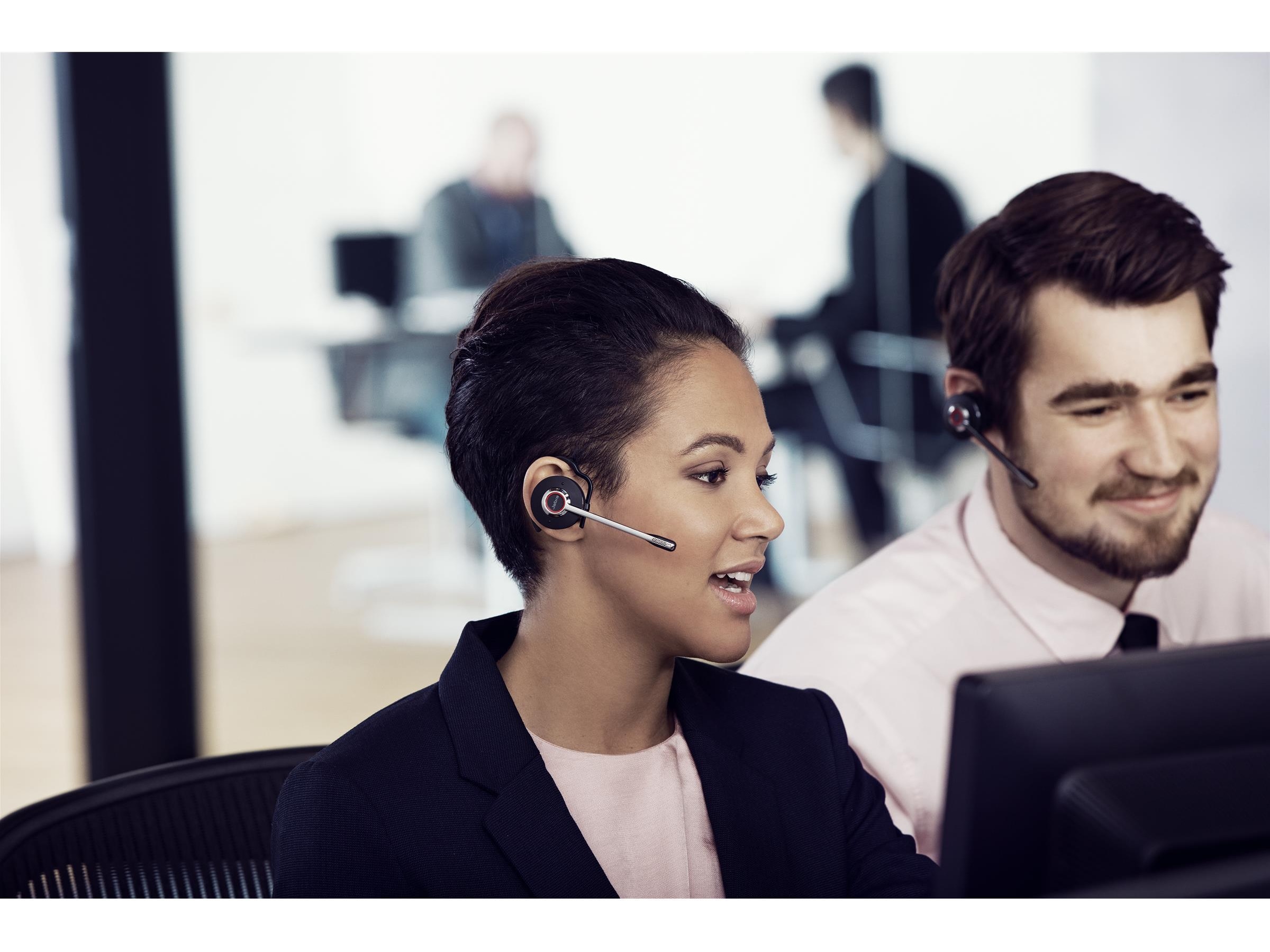 Du kan fritt bevege deg rundt med Jabra Engage 75 Stereo med rekkevidde på opptil 150 meter. Jabra Engage-serien bruker også en DECT-standard som kan håndtere langt flere headsets i samme rom, slik at du er beskyttet mot forstyrrelser fra andre brukere.