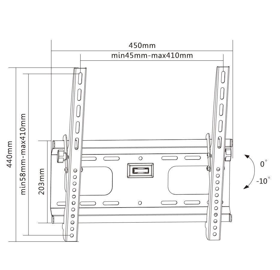 Veggfestet bygger 46mm fra veggen. I skjermfestet er det en tilt funksjon som lar deg tilte TVen 10 grader frem, til en bedre visningsvinkel. Dette veggfestet gir deg muligheten til å montere skjermen i enten landskap- (horisontal), eller portrettvisning (vertikal).