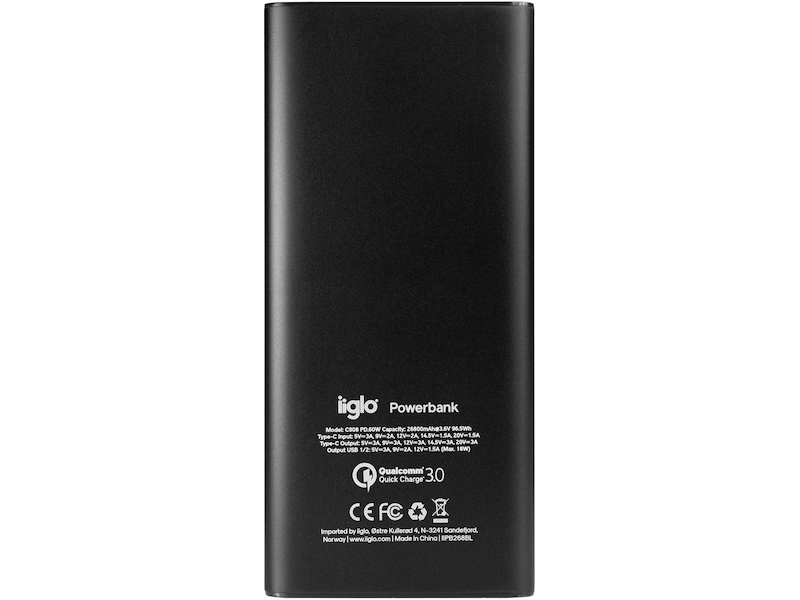 Strømenhetsdetaljer Nødlader: 4-pins USB Type A - 12 W, Nødlader: 24-pins USB-C - 60 W, Nødlader: 4-pins USB-type A QC - 18 W
