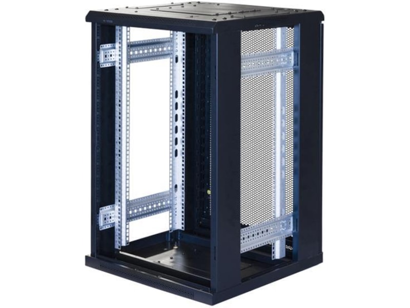 Det 19" gulvkabinettet har en front med glassdør med lufteåpninger på hver side av glasset, perforerte bakdører og avtagbare sidepaneler. Det har plass til kabelinnføring på bunnen og i taket. Taket har også plass til å installere viftepakken. Du kan ha kabinettet stående på hjul eller uten. Front- og bakdørene kan henges på enten høyre eller venstre side.