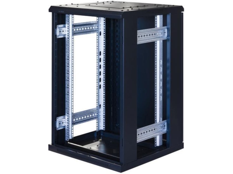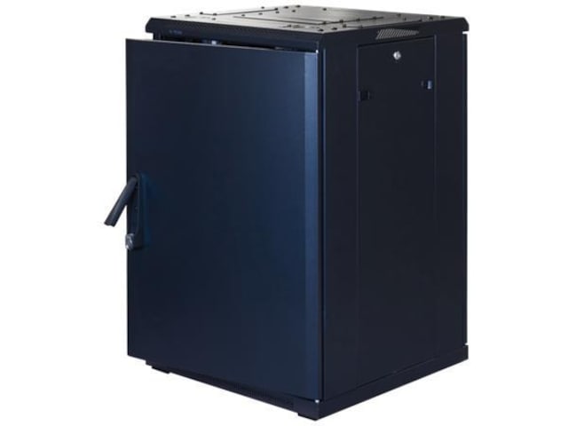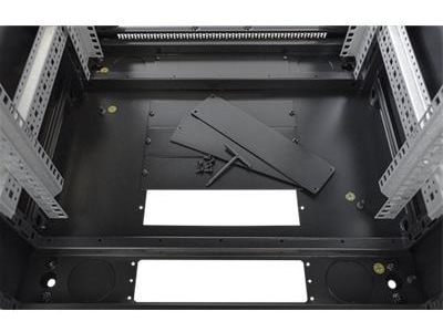 Det 19" gulvkabinettet har en front med glassdør med lufteåpninger på hver side av glasset, perforerte bakdører og avtagbare sidepaneler. Det har plass til kabelinnføring på bunnen og i taket. Taket har også plass til å installere viftepakken. Du kan ha kabinettet stående på hjul eller uten. Front- og bakdørene kan henges på enten høyre eller venstre side.