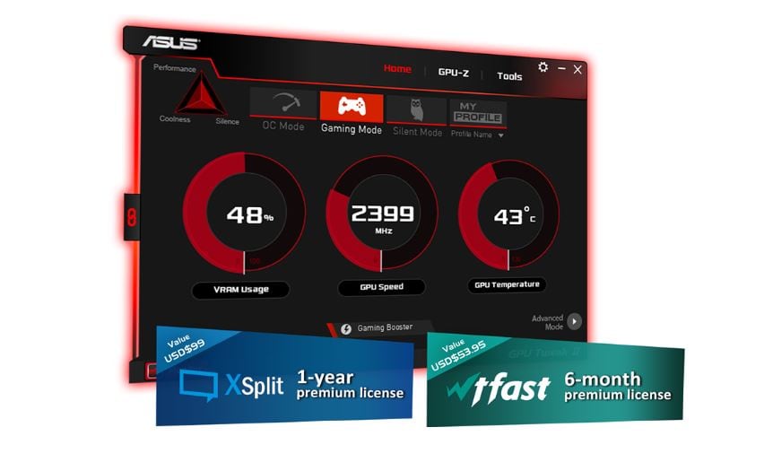 WTFast Gamers Private Network (6-måneders Premium-lisens), XSplit Gamecaster (1-års premielisens), Displaydrivere, ASUS GPU Tweak II