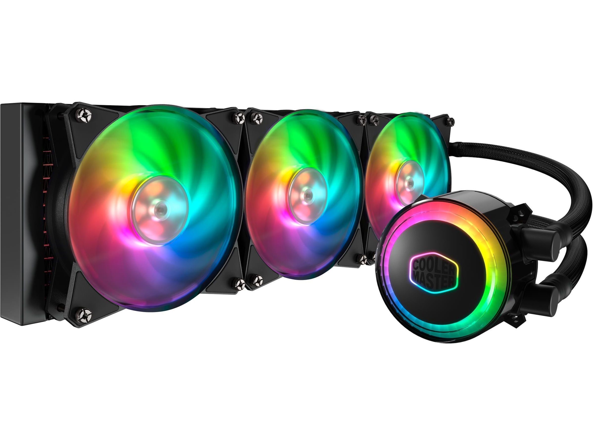 Adresserbare RGB LED-er på pumpen og viftene for full fargetilpasning som kan styres via Cooler Masters programvare Lightning Control. - FEP med muffer
