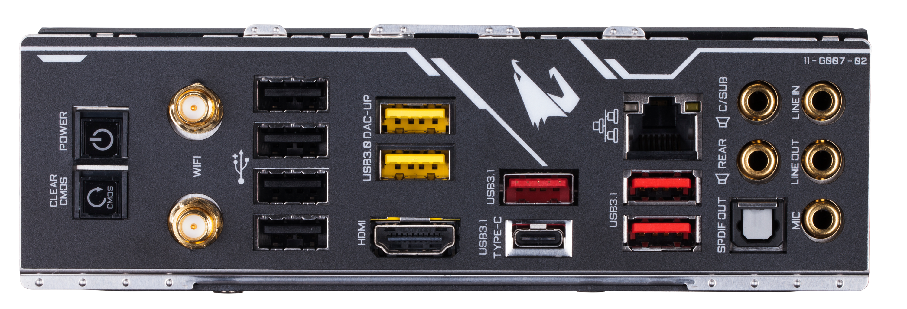 4 x USB 2.0, 1 x HDMI, 1 x TOSLINK, 1 x lydutlinje - minijakk, 2 x USB 3.1 Gen 1, 1 x lydinnlinje - minijakk, 1 x LAN (Gigabit Ethernet), 1 x lydutlinje (senter/subbasshøyttaler) - minijakk, 1 x lydutlinje (bakre) - minijakk, 3 x USB 3.1 Gen 2, 1 x mikrofon - minijakk, 1 x USB-C Gen2