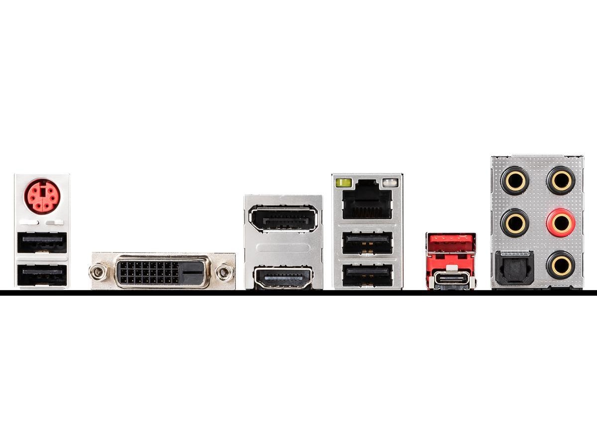 1 x lydutlinje - minijakk, 1 x HDMI, 1 x PS/2-tastatur / -mus, 1 x lydutlinje (senter/subbasshøyttaler) - minijakk, 1 x lydutlinje (bakre) - minijakk, 1 x DisplayPort, 1 x USB 3.1 Gen 2, 1 x mikrofon - minijakk, 1 x TOSLINK, 4 x USB 2.0, 1 x LAN (Gigabit Ethernet), 1 x lydinnlinje - minijakk, 1 x USB-C Gen2