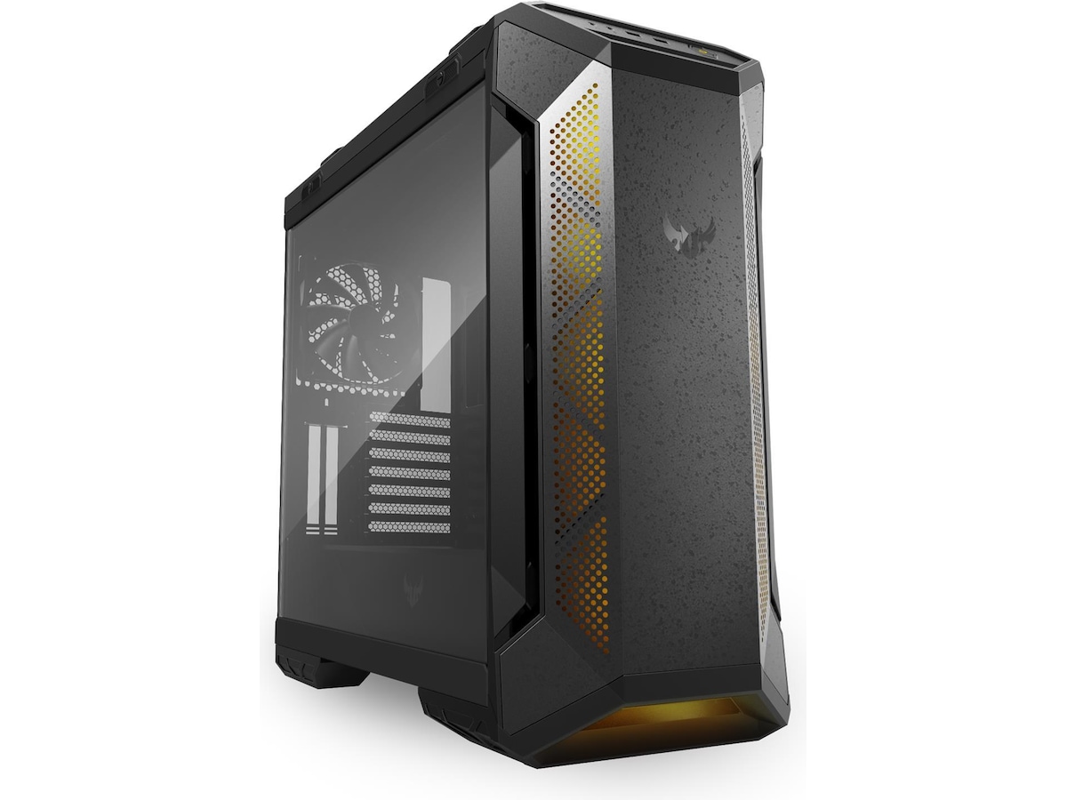 Med et sidepanel i røkt glass i full høyde lar TUF Gaming GT501 deg vise fram konstruksjonen fra topp til bunn - slik at komponentene, tilpasningene og Aura-belysningene er klart synlige. Dette panelet er herdet for styrke og hengslet i bunnen for å lette åpning.