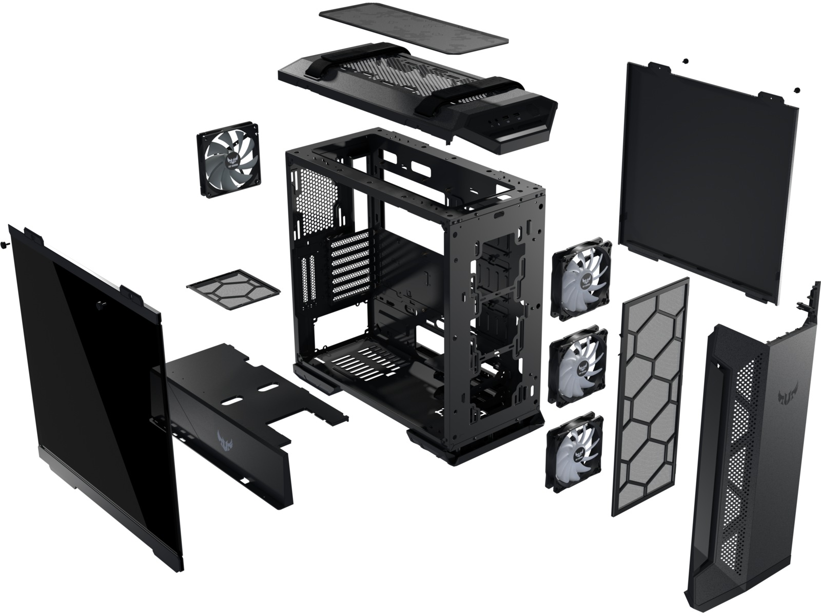 - Designet for å bli lagt merke til: Frontpanel av metall med tilpasset TUF Gaming-sprutmønster og 4 mm tykt, røkt, herdet glasspanel for å vise frem din konstruksjons innvendige sider.