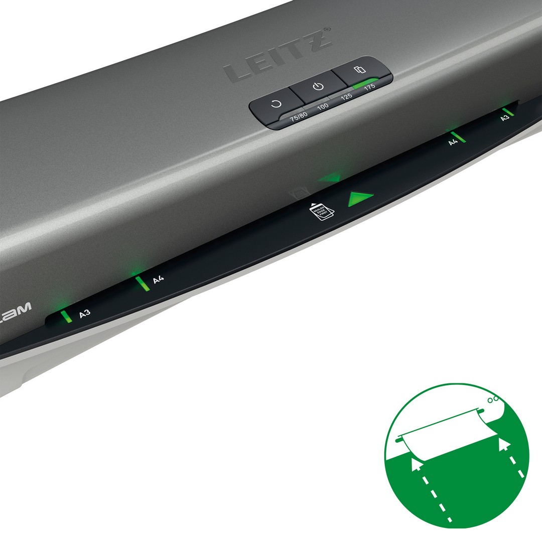 Den elegante og kraftige Leitz iLAM Office Pro A3 lamineringsmaskinen kombinerer stil og høy ytelse. Den er enkel i bruk, med rask oppvarming på 1 minutt og laminering av et 80 my A4-ark på bare 23 sekunder for effektiv dokumentbeskyttelse. Med frontmonterte knapper kan du velge mellom fire innstillinger for lommetykkelser (80, 100, 125 eller 175 my), i tillegg til manuell reverseringsknapp og automatisk reversering med aktiv jam-deteksjon for sømløs laminering. Smart LED-veiledning øker brukervennligheten: rødt lys under oppvarming som skifter til grønt med lydsignal når maskinen er klar. Etter 15 minutter uten aktivitet blinker lyset rødt, og maskinen går i dvalemodus. - Høy kapasitet for rask og enkel laminering.