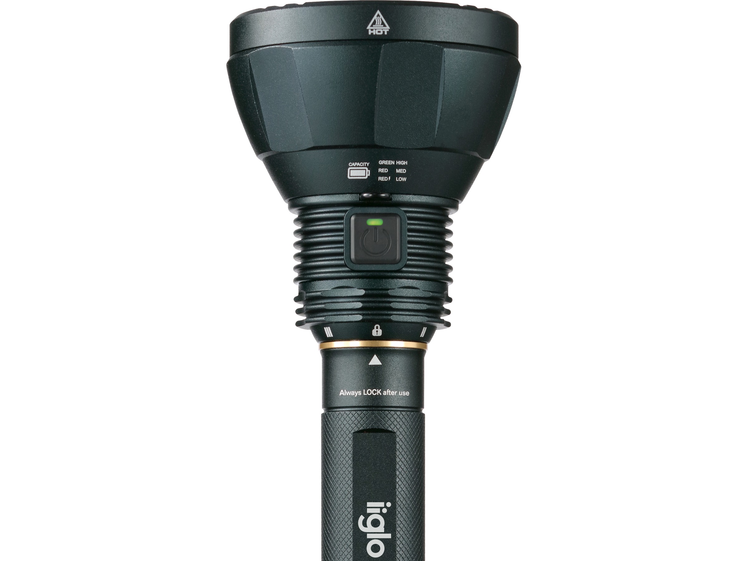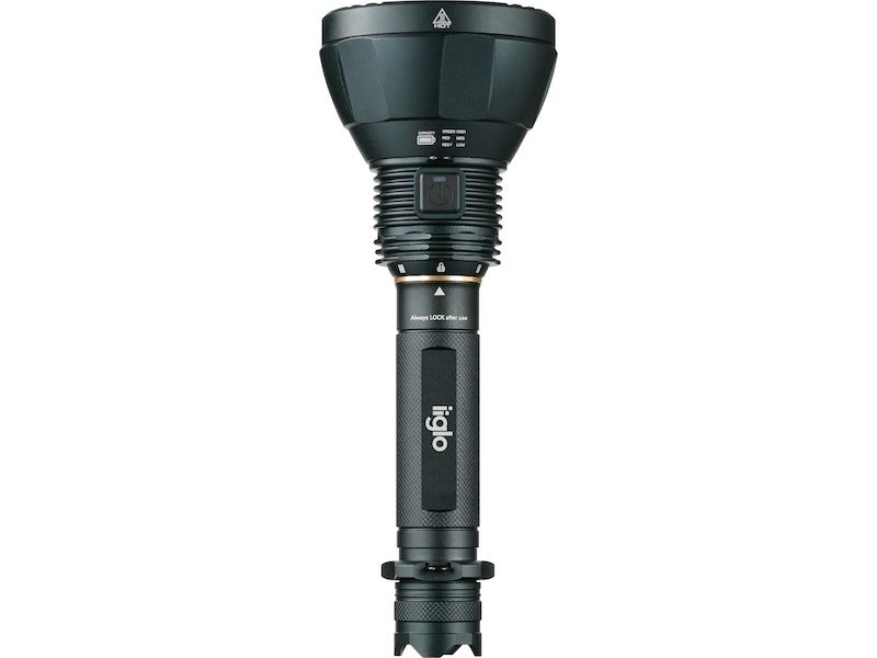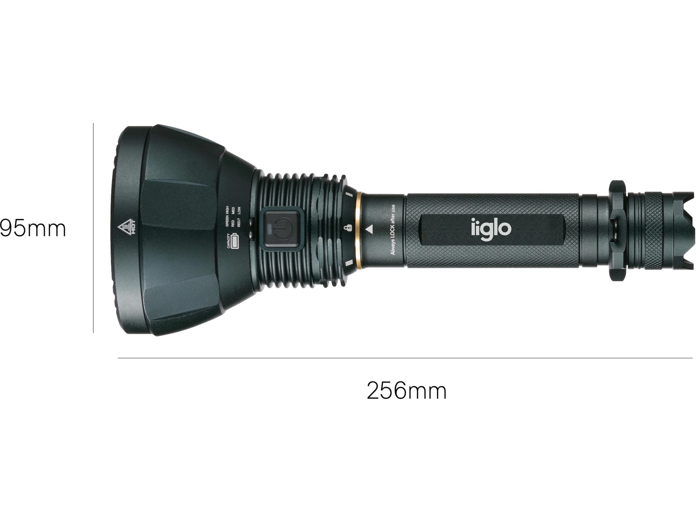 Iiglo LED lommelykt 10 000LM er i aluminium og har mørk grønn farge. Den er 256 mm lang og veier 940g inkludert medfølgende batterier. Lampens bredde er 95 mm.