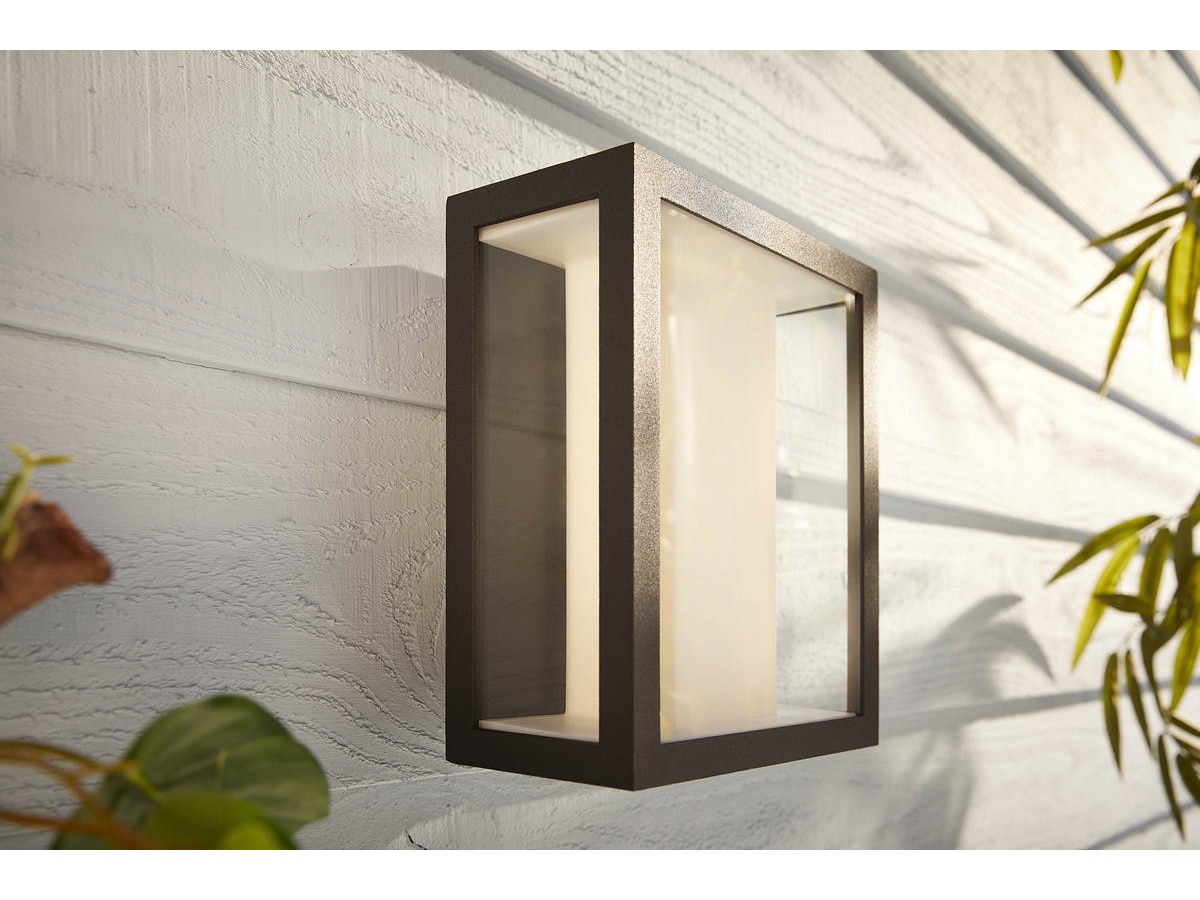 Philips Hue Impress er en moderne og unik serie av utendørsarmaturer. Denne vegglanternen krever en fast 240 V installasjon.