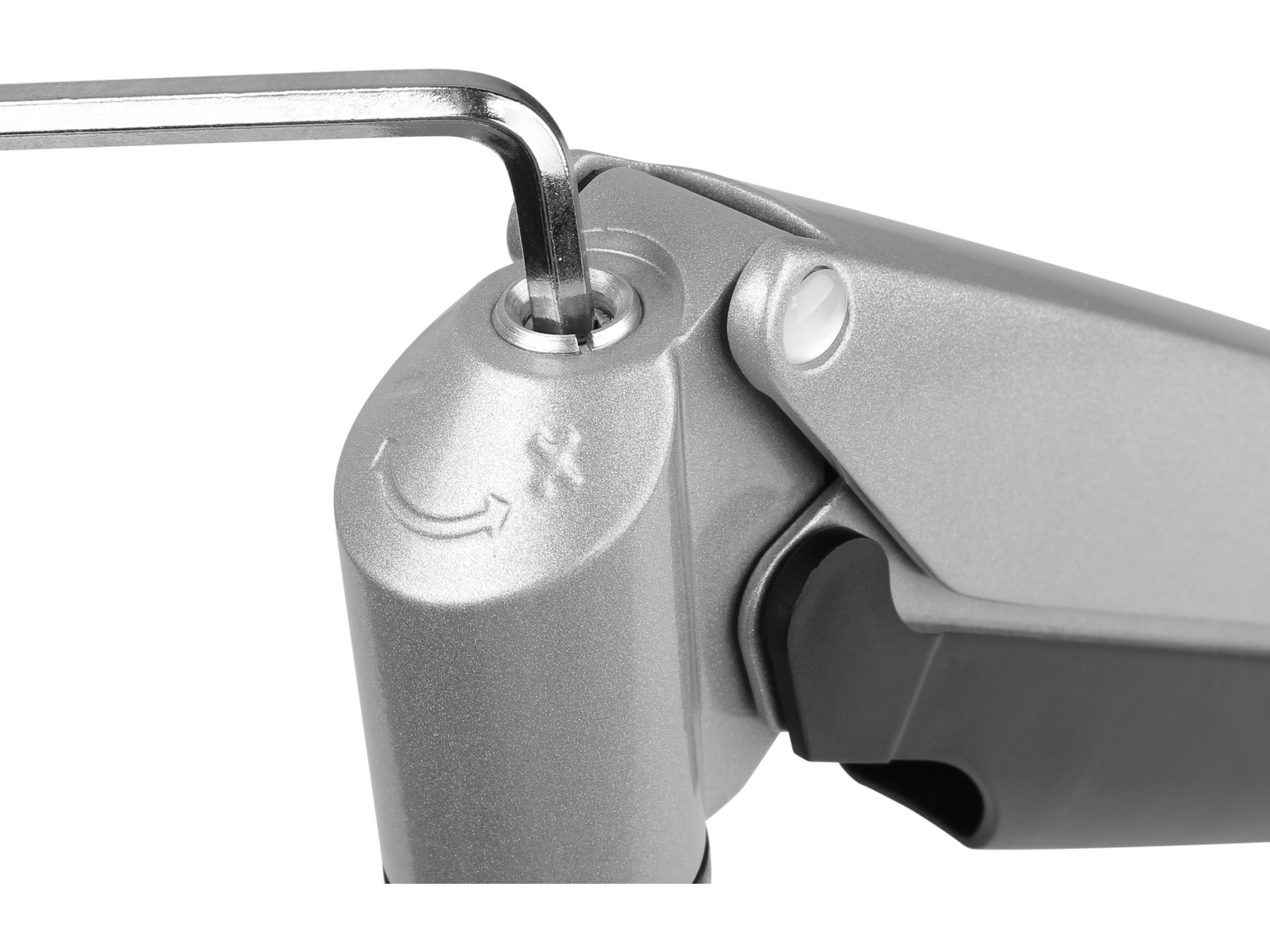 iiglo Mantis har en gassfjær som lar deg plassere skjermen din nøyaktig i ønsket høyde, vippe- og svinggrad. Du kan også trekke den nærmere deg eller trekke den tilbake. Festet kan holde en vekt på opptil 9 kg samtidig som det hjelper deg med å bevare en ergonomisk kroppsstilling når du jobber.