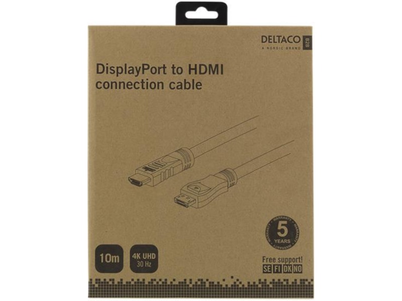 DisplayPort til HDMI-kabel som lar deg koble til en UHD-skjerm fra en kilde opptil 10 meter unna. Takket være LT8611SXA-brikkesettet kan du få opptil 3840x2160 i 30Hz, selv om skjermen er 10m fra kilden.