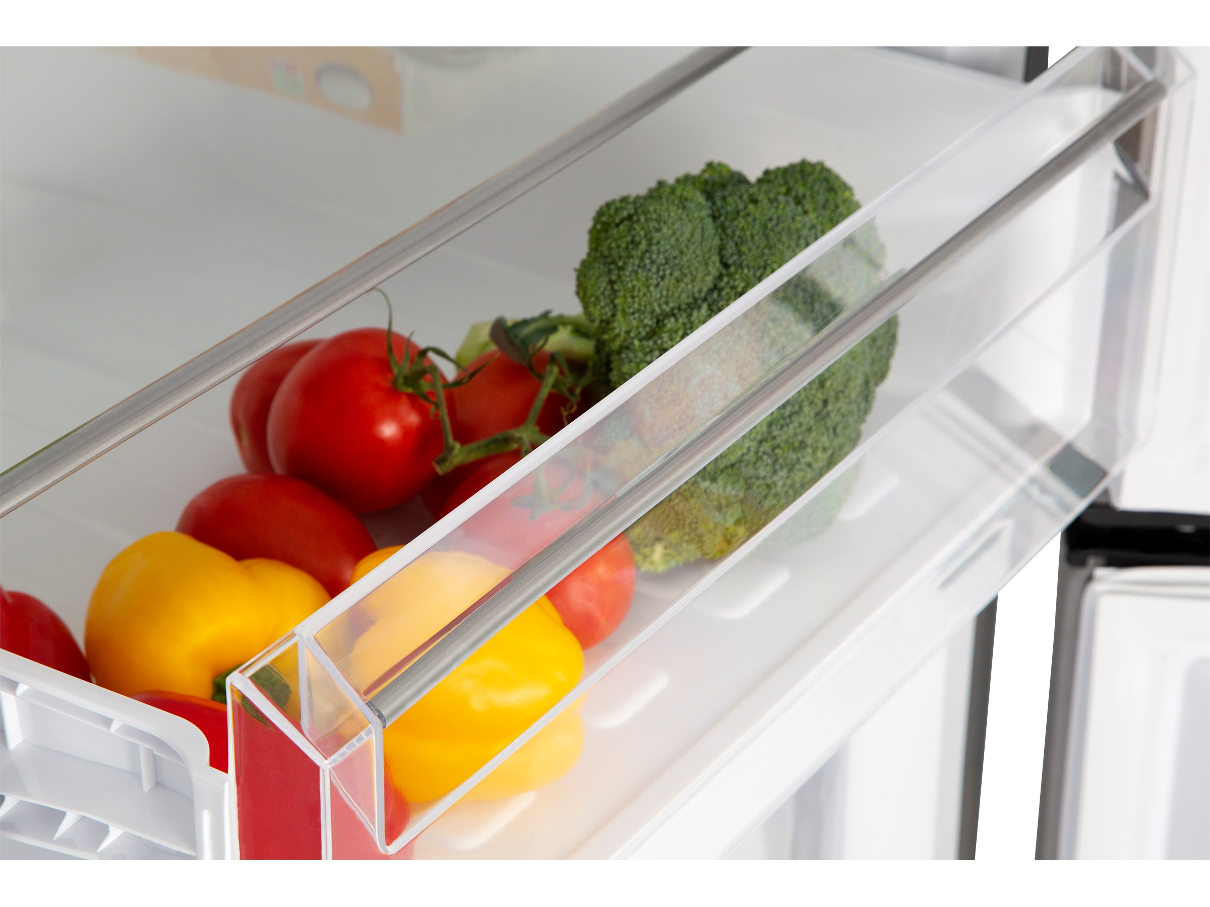 Det er enkelt å finne matvarene til alle døgnets tider. Når du åpner kjøleskapsdøren skrur LED-lampene i toppen seg på. Har du ujevnt gulv? Det er ikke noe problem. Kombiskapet har justerbare føtter, så du kan selv justere høyden. Innvendig er kjøleskapet innredet med fem ulike hyllehøyder for glassplatene, tilpasse hyller etter behov og du kan enkelt ta ut glasshyllene for rengjøring. Nederst i kjøleskapet er det en stor skuff som passer utmerket til grønnsaker. BSkuffen har en tilhørende glassplate over som fungerer som et deksel og lukker skuffen godt. På kjøleskapsdøren er det tre avtakbare hyller med fire ulike hyllehøyder for enkel rengjøring, hvor alle hyllene på døren har en dybde på 11,5cm og en lengde på 42cm.