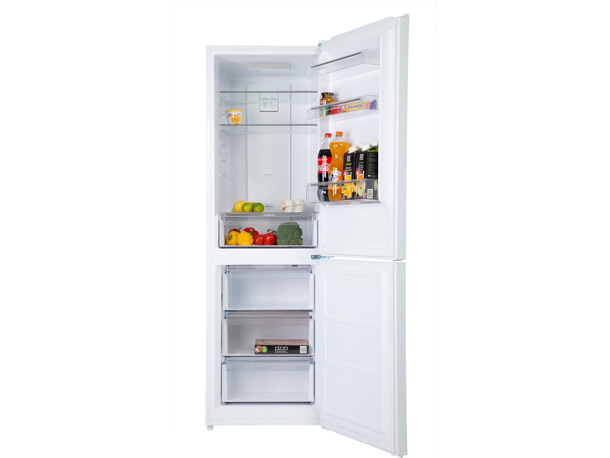 iiglo kombiskap med kjøler og fryser, er alt du trenger for å oppbevare dine matvarer til rett temperatur. Kombiskapet har et kontrollpanel øverst på innsiden av skapet. Dette panelet kommer med LED-display og berøringsknapper, som lar deg se og styre temperaturen på kjøler og fryser. I tillegg kan du velge mellom ulike innstillinger som ECO-mode, ferie-mode og super-mode. Kombiskapet har en tastelås som du kan skru av ved å holde «MODE»-knappen inne i 3 sekunder, denne tastelåsen vil skru seg på igjen etter 25 sekunder. Hvis døren ikke blir lukket, vil du høre en alarm som slutter å pipe i det du lukker igjen døren. Dørene kan monteres på begge sider for høyre/venstre åpning, og passer derfor inn i de fleste kjøkken.
