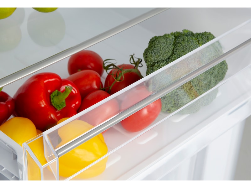 Det er enkelt å finne matvarene til alle døgnets tider. Når du åpner kjøleskapsdøren skrur LED-lampene på hver langside seg på med en fadeeffekt, og lyset øker i styrke jo mer du åpner døren. Har du ujevnt gulv? Det er ikke noe problem. Kombiskapet har justerbare føtter, så du kan selv justere høyden. Innvendig er kjøleskapet innredet med fem ulike hyllehøyder for glassplatene, tilpasse hyller etter behov og du kan enkelt ta ut glasshyllene for rengjøring. Nederst i kjøleskapet er det en stor skuff som passer utmerket til grønnsaker. I tillegg finnes det en ekstra kjølig, litt mindre skuff plassert ovenfor den klassiske grønnsaksskuffen. Begge skuffene har en tilhørende glassplate over som fungerer som et deksel og lukker skuffen godt. På kjøleskapsdøren er det tre avtakbare hyller med fire ulike hyllehøyder for enkel rengjøring, hvor alle hyllene på døren har en dybde på 11,5cm og en lengde på 42cm.