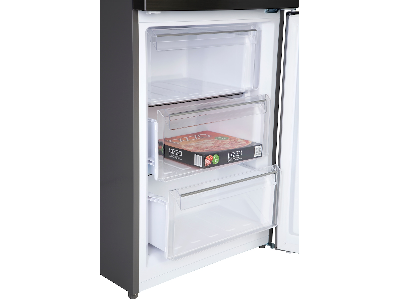 iiglo kombiskap med kjøler og fryser, er alt du trenger for å oppbevare dine matvarer til rett temperatur. Kombiskapet har et kontrollpanel øverst på innsiden av skapet. Dette panelet kommer med LED-display og berøringsknapper, som lar deg se og styre temperaturen på kjøler og fryser. I tillegg kan du velge mellom ulike innstillinger som ECO-mode, ferie-mode og super-mode. Kombiskapet har en tastelås som du kan skru av ved å holde «MODE»-knappen inne i 3 sekunder, denne tastelåsen vil skru seg på igjen etter 25 sekunder. Hvis døren ikke blir lukket, vil du høre en alarm som slutter å pipe i det du lukker igjen døren. Dørene kan monteres på begge sider for høyre/venstre åpning, og passer derfor inn i de fleste kjøkken.