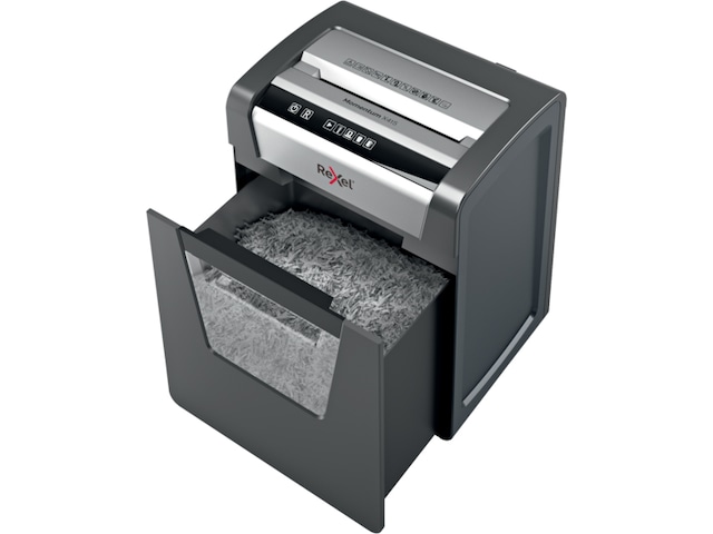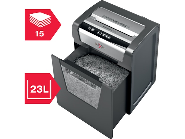 Kraft til å makulere mer! Rexel Momentum X415 makulerer opptil 15 ark samtidig med 2 timers kontinuerlig driftstid. Anti-Jam teknologi forhindrer dokumentstopp. Perfekt modell for små kontor. Sikkerhetsgrad P4, krysskutt 4 x 40 mm biter. Stillegående med intuitivt og enkelt berøringspanel. Beholder med 23 liters kapasitet (225 A4 ark).