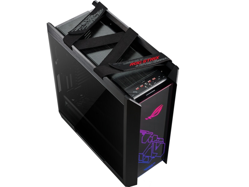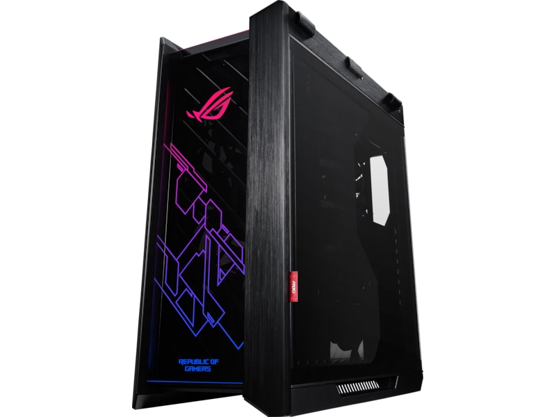 Et flerfunksjonsdeksel med GPU-holdere gjemmer kablene på smart vis, gir solid støtte til grafikkortene og lar en SSD- eller ROG Aura-terminal monteres for fremvisning. Plasseringen kan justeres for å få plass til et ATX- eller EATX-hovedkort.