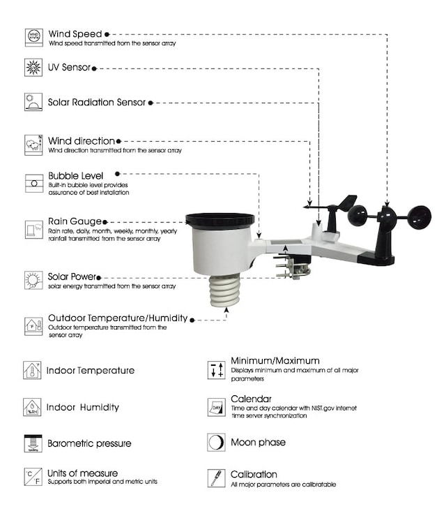 Komplett stasjon som måler temperatur og luftfuktighet både ute og inne, vindretning og hastighet, UV-verdi (lysstyrke), samt regnmåler. Barometeret har også mulighet for å forutse været frem i tid og gir en indikasjon på om det blir sol, delvis sol, overskyet, regn eller snø.
