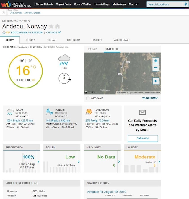 Innedelen kan plasseres i vinduskarm e.l. og gir deg den viktigste informasjonen i et bilde. Du kan også veksle mellom ulik informasjon ved å trykke på knappene under. Lurer du på hvor mye nedbør som har kommet siste døgn, uke eller måned kan du trykke på «RAIN» for å veksle mellom ulik info.