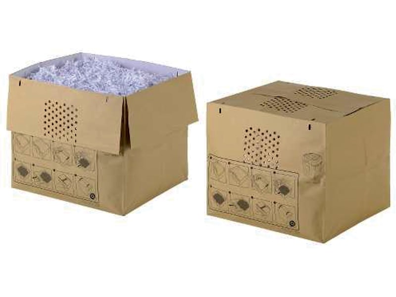 Miljøvennlig papirsekk til Rexel Auto+ 750 X/M makuleringsmaskiner. Plasser papirsekken i den uttrekkbare avfallsbeholderen. Forsiden er perforert, så det er mulig å se hvor mye papir som er makulert. Når sekken er full, løftes den ut av beholderen og lukkes med den selvklebende tapen. Hele papirsekken kan dermed kastes i beholderen for resirkulering av papir.