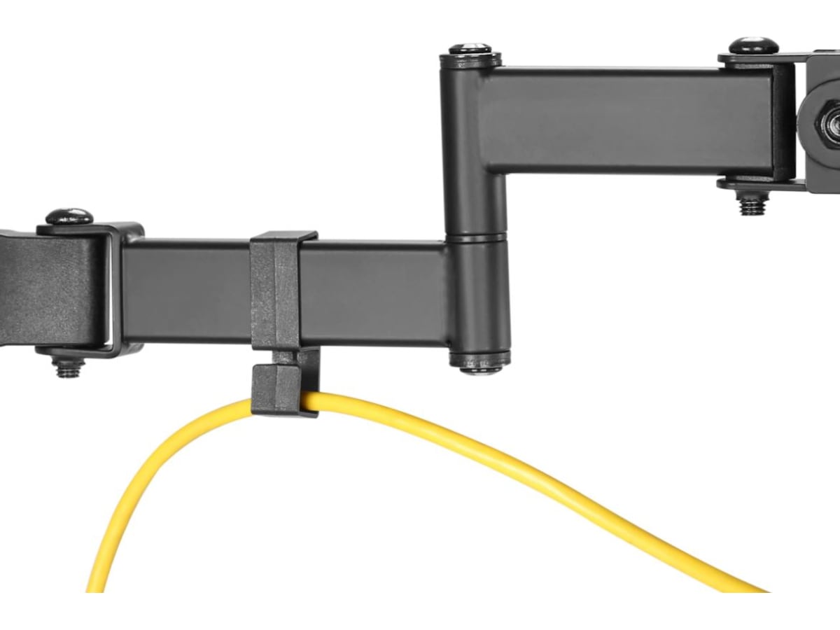 iiglo-skjermfestet har en tredobbelt dreiemekanisme som lar deg plassere skjermen nøyaktig i ønsket vippe- og svinggrad. Du kan også trekke den nærmere deg eller trekke den tilbake. I tillegg kan du rydde opp i kablene dine ved å bruke den medfølgende kabelkroken.