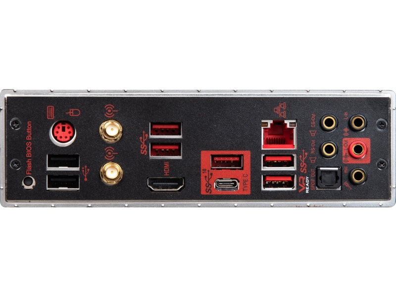 | Grensesnitt | 2 x USB 2.0, 1 x LAN (Gigabit Ethernet), 1 x PS/2-tastatur / -mus, 1 x lydutlinje (senter/subbasshøyttaler) - minijakk, 2 x USB 3.2 Gen 1, 3 x USB 3.2 Gen 2, 1 x USB-C Gen2, 1 x lydutlinje - minijakk, 1 x lydutlinje (bakre) - minijakk, 1 x HDMI, 1 x TOSLINK, 1 x mikrofon - minijakk, 1 x lydinnlinje - minijakk |