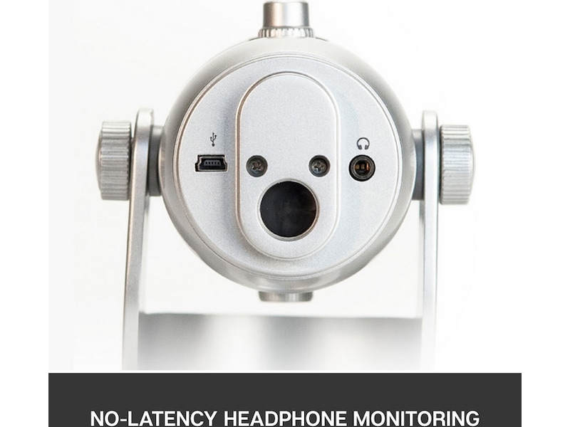 Yeti-mikrofonen er utstyrt med en 3,5-millimeter hodetelefonutgang og lar deg lytte til det du tar opp i sanntid, uten forsinkelser, noe som betyr at du ikke lenger vil høre en tone 3 sekunder etter at du har spilt den inn. Du kan justere volumet på hodetelefonene med kontrollen foran på mikrofonen.