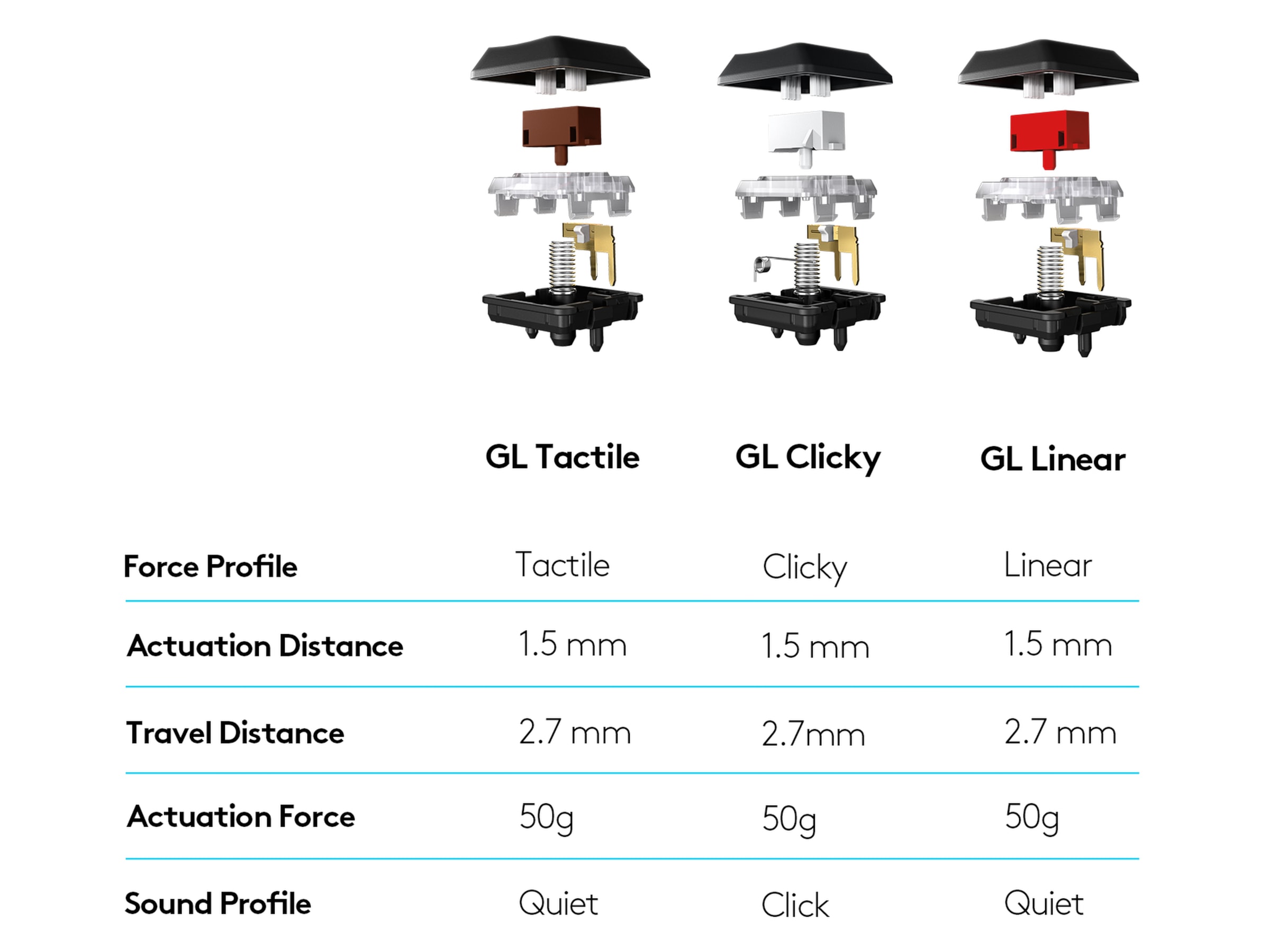 Nye høyytelses spillbrytere tilbyr samme hastighet, nøyaktighet og ytelse som en mekanisk bryter, men med kun halve høyden. GL Tactile-brytere avgir en merkbar bumpelyd ved aktivering. Kommer i tre alternativer: GL Tactile, GL Linear eller GL Clicky.