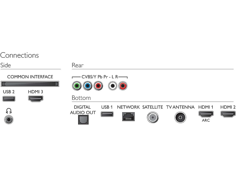 Kombinasjonsvideo / komponentvideo / audioinngang - bak, 2 x HDMI - bak, HDMI - side, Hodetelefoner - side, Digital lydutgang (optisk) - bak, USB - side, LAN - bak, USB - bak