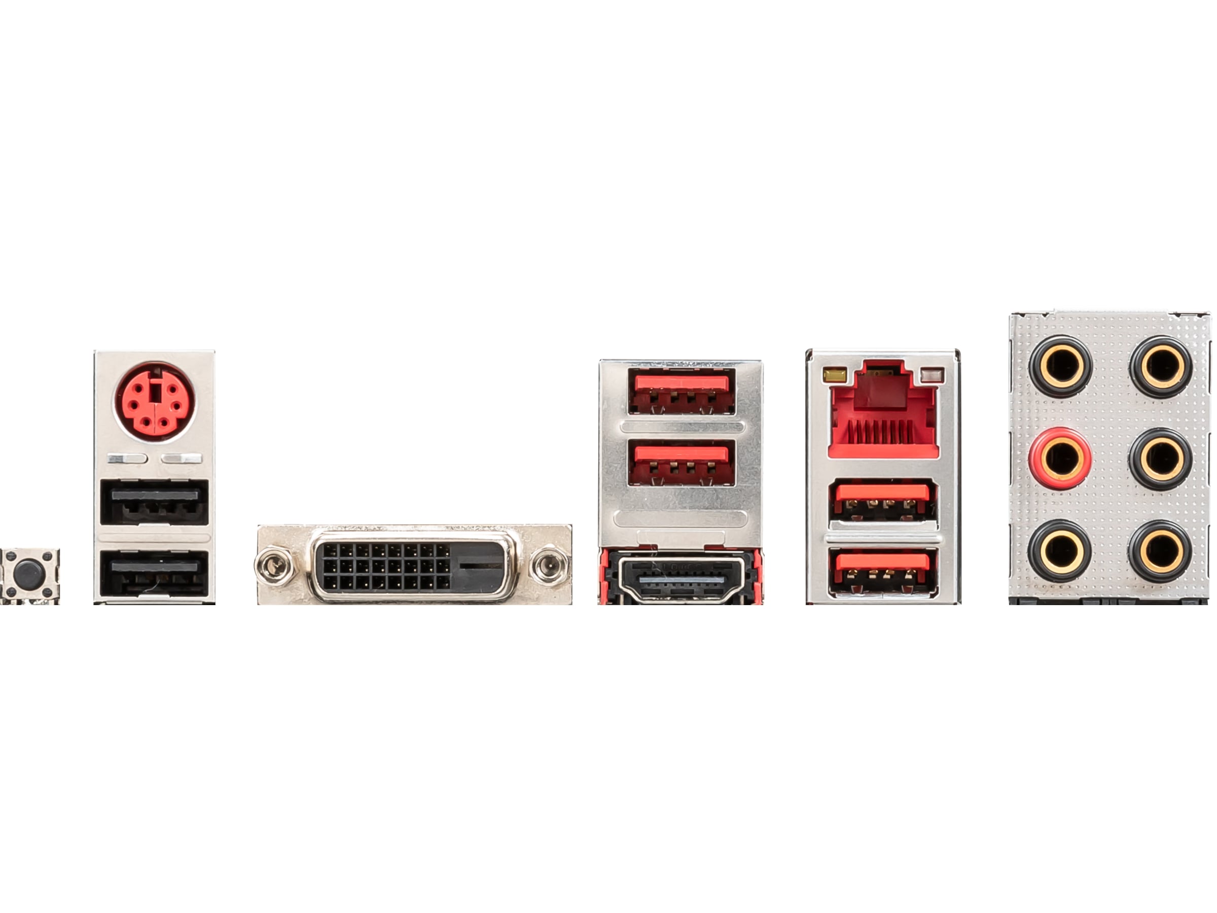 1 x lydutlinje - minijakk, 2 x USB 2.0, 1 x LAN (Gigabit Ethernet), 1 x lydutlinje (side-surround) - minijakk, 1 x mikrofon - minijakk, 1 x lydutlinje (bakre) - minijakk, 2 x USB 3.1 Gen 1, 1 x lydutlinje (senter/subbasshøyttaler) - minijakk, 1 x HDMI, 1 x PS/2-tastatur / -mus, 2 x USB 3.1 Gen 2, 1 x lydinnlinje - minijakk, 1 x DVI-D