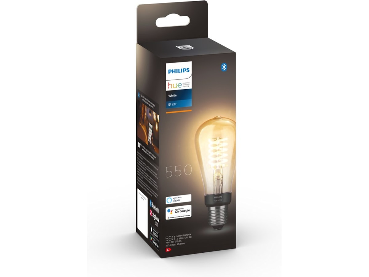 Philips Hue White glødelyskilde har gjennomsiktig glass med synlig filament-LED som skaper en koselig atmosfære rundt lyskilden.