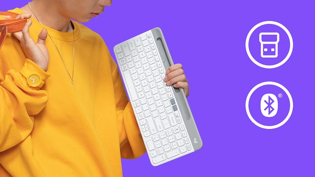 Du kan velge å koble til ved hjelp avBluetooth®trådløs teknologi og/eller 2,4 GHz USB-mottakeren som oppbevares i batteriluken. Du får en sterk og sikker trådløs tilkobling med 10 mrekkevidde1og et kabelfritt skrivebord.
