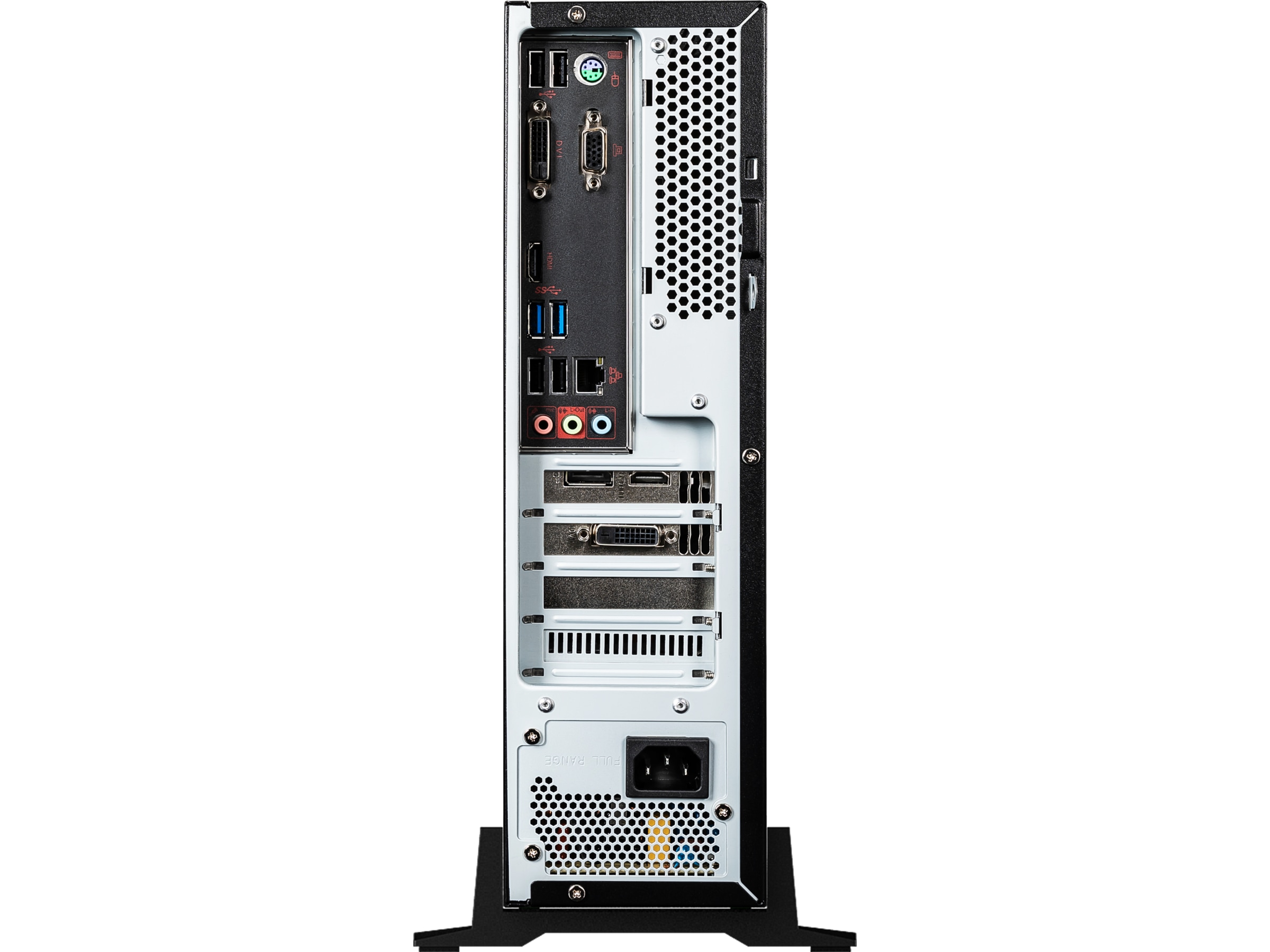 1 x hodetelefon (1 foran), 1 x lydutlinje, 1 x lydinnlinje, DisplayPort, 1 x PS/2-tastatur / mus, 2 x USB 3.1 Gen 1, 1 x LAN (Gigabit Ethernet), 1 x VGA, 6 x USB 2.0 (2 foran, 4 bak), 1 x DVI-D, HDMI-utgang, 2 x mikrofon (1 foran, 1 bak)
