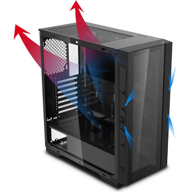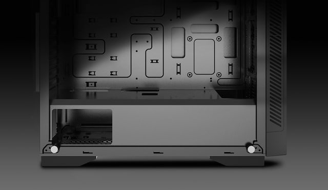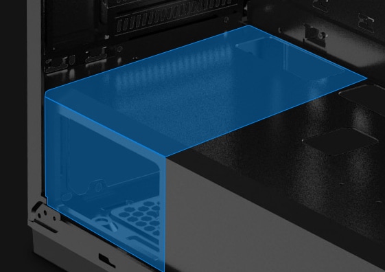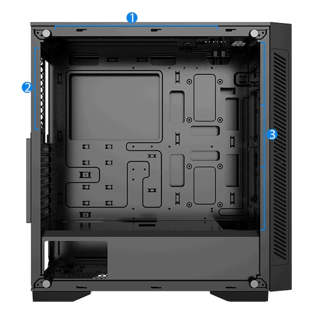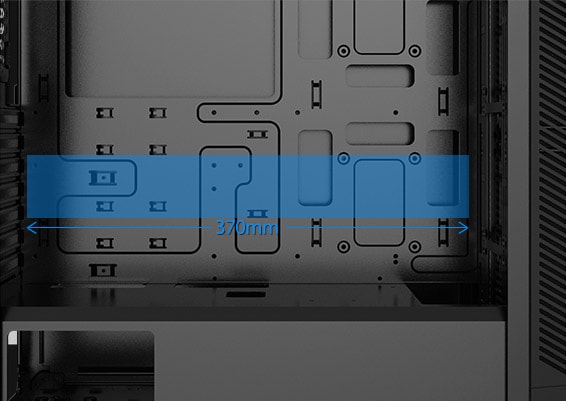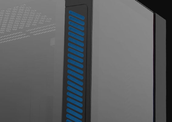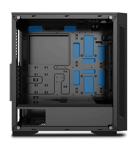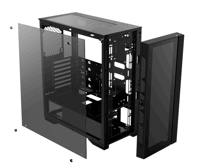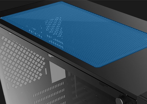 Bunnstøvfilter, PSU-skjermutskjæring, Toppmagnetstøvfilter, RGB-lyssystem, Støtter 120/140/240/280/360-mm radiator i frontpanel, Støtter 120/140/240 mm radiator på toppen, Frontstøvfilter, Frontpanel i herdet glass, Støtter 120 mm-radiator bak, Kabelstyringssystem