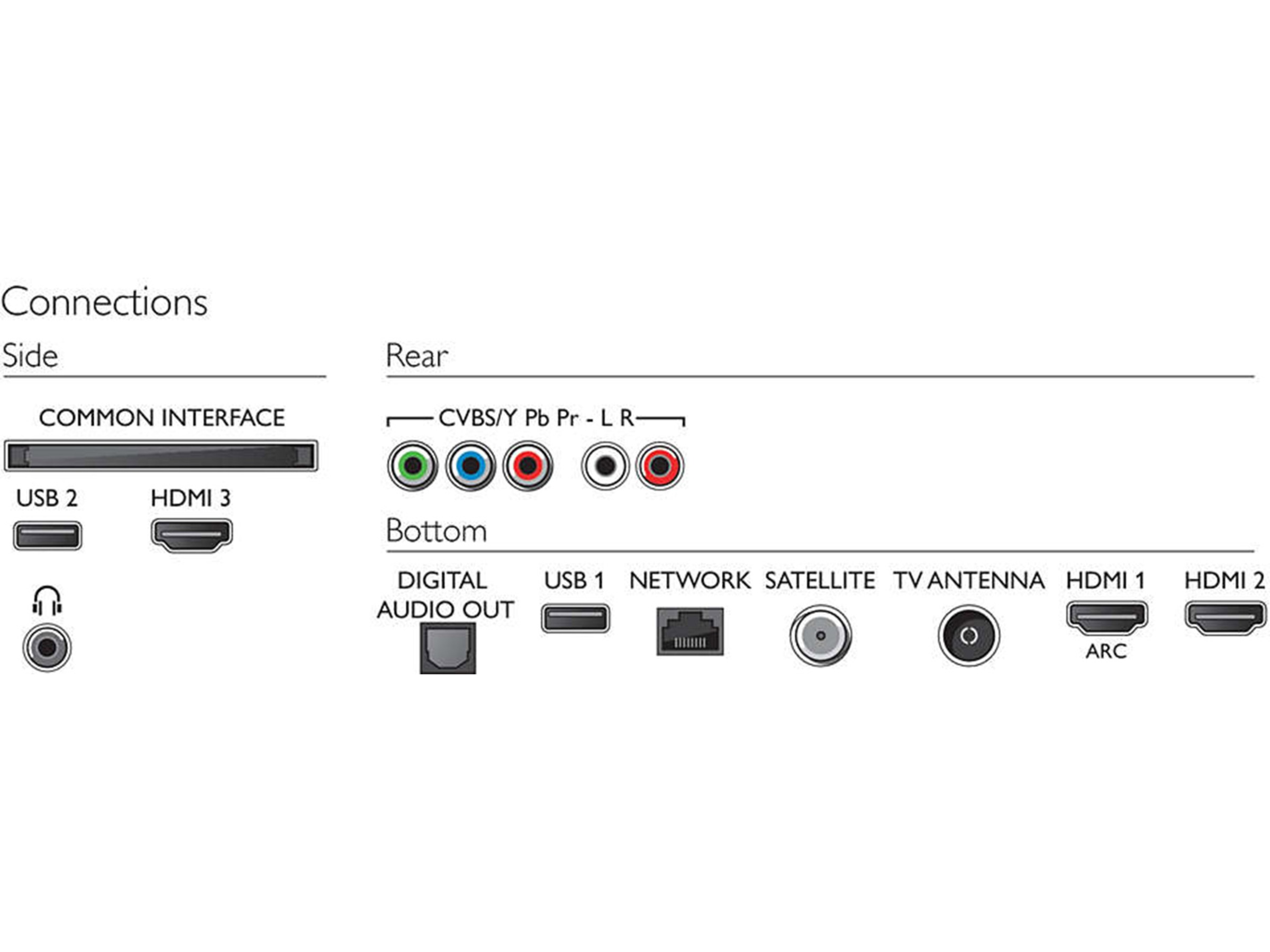 HDMI - side, Kombinasjonsvideo / komponentvideo / audioinngang - bak, Digital lydutgang (optisk) - bak, LAN - bak, Hodetelefoner - side, 2 x HDMI - bak, USB - bak, USB - side