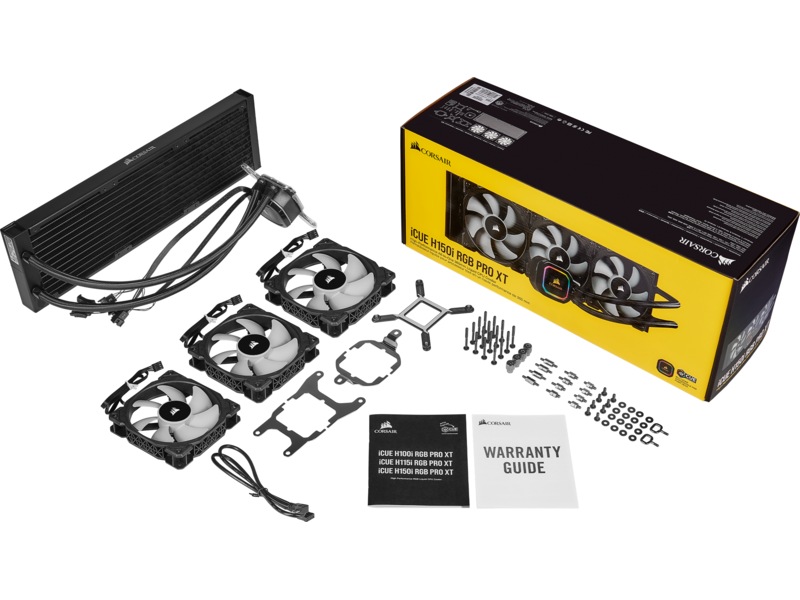 Corsair iCUE H150i RGB PRO XT er en alt-i-ett-væskekjøler, bygd for både drift med lavt støynivå og ekstrem CPU-kjøling, med en 360 mm radiator, tre Corsair ML120 PWM-vifter og 16 RGB LED-lys.