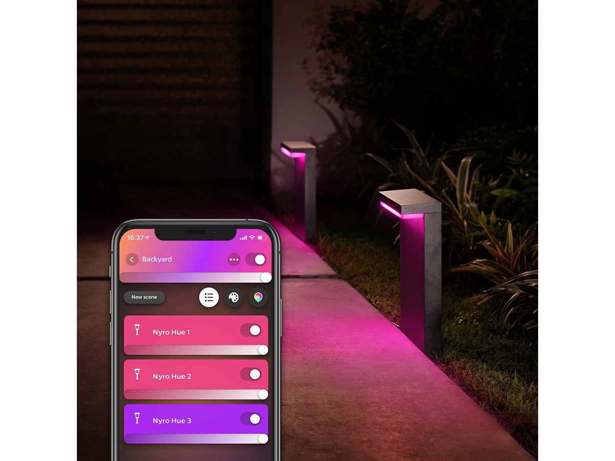 Med 16 millioner nyanser er det bare fantasien som setter grenser for hva du kan gjøre med fargene, og angi ulike lysscener avhengig av humør, arrangement eller høytid. Hvis du kjøper en kompatibel bevegelsessensor for utendørs bruk, kan du gjøre enda mer. Lysene slås på eller av avhengig av om du går inn i eller forlater huset. Du kan stille inn en timer som kontrollerer når lysene slås på eller av til faste eller tilfeldige tider via en app på telefonen eller nettbrettet. Armaturen er IP44, som betyr at den er beskyttet mot vannsprut og har lang levetid. Det gjør denne armaturen til et trygt valg for deg som er ute etter den beste opplevelsen av utendørsbelysning.