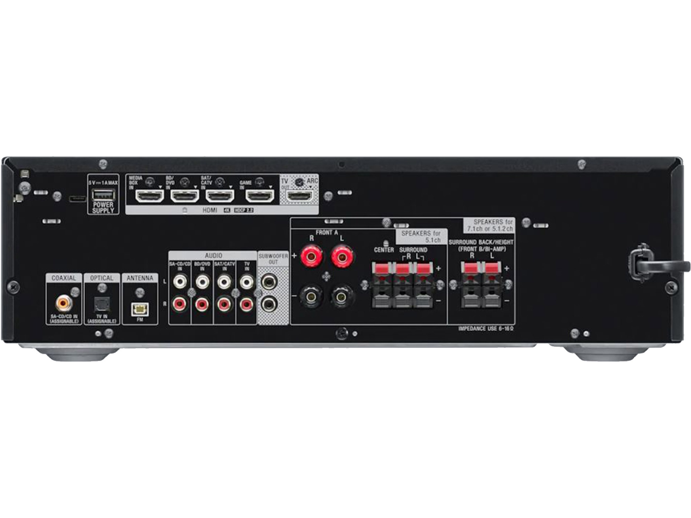 HDMI-utgang (19-pin HDMI type A) - bak, 4 x lydinngang (RCA phono x 2) - bak, Hodetelefoner (6,3 mm-stereojakk) - foran, 2 x basshøyttaler-utgang (RCA) - bak, SPDIF-inngang (TOSLINK) - bak, 4 x HDMI-inngang (19-pin HDMI type A) - bak, SPDIF-inngang (RCA) - bak
