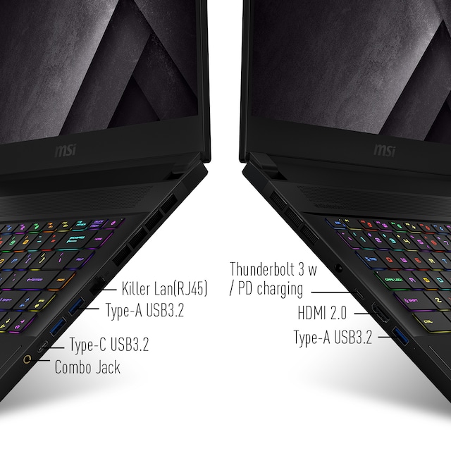 1x Thunderbolt 3 w/ PD charging, 1x Type-C USB3.2, 3x Type-A USB3.2, 1x HDMI 2.0, 1x Combo Jack, 1x Killer Lan