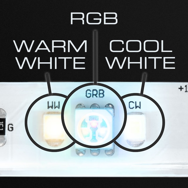 En tradisjonell RGB-list danner hvitt lys fra røde, grønne og blå farger som skinner samtidig. For å gi deg en renere hvit glød har Svive Aurora separate lysdioder for både varmt og kaldt hvitt.