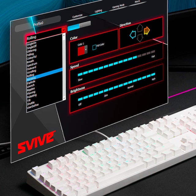 Svive Triton Full-tastaturet er utstyrt med RGB-bakgrunnsbelysning, noe som gir deg muligheten til å tilpasse tastaturet ved å velge en hvilken som helst fargesammensetning du ønsker ved hjelp av den medfølgende programvaren. Med over 16 millioner farger og sju forskjellige lysmoduser, kan du sikre at tastaturet matcher resten av oppsettet ditt, og holde alt opplyst i mørket. I tillegg gir Svive Triton-programvaren deg muligheten til å tilordne utallige makrofunksjoner til tastene dine. Makroer øker produktiviteten og hastigheten i spill når det teller som mest.