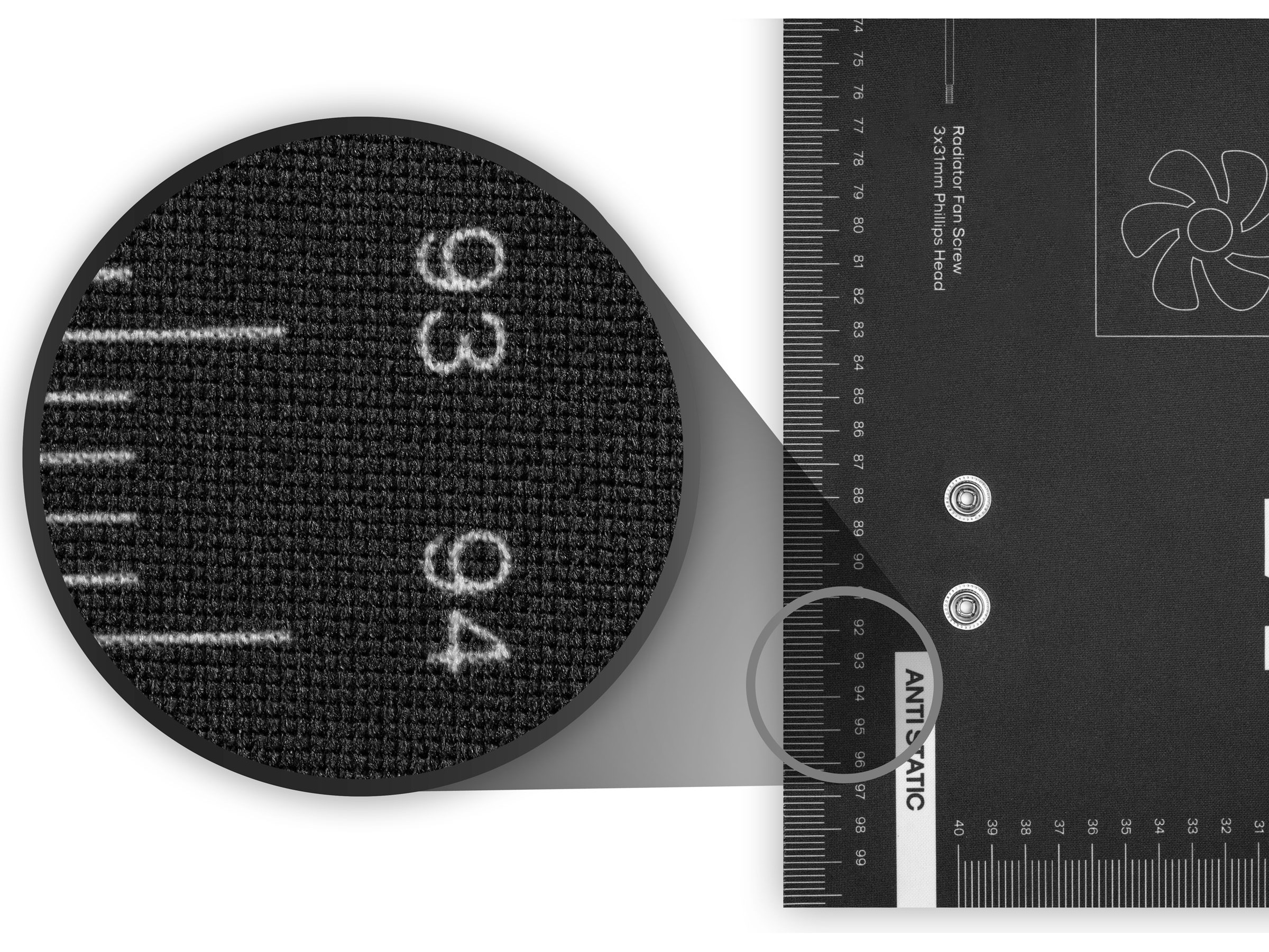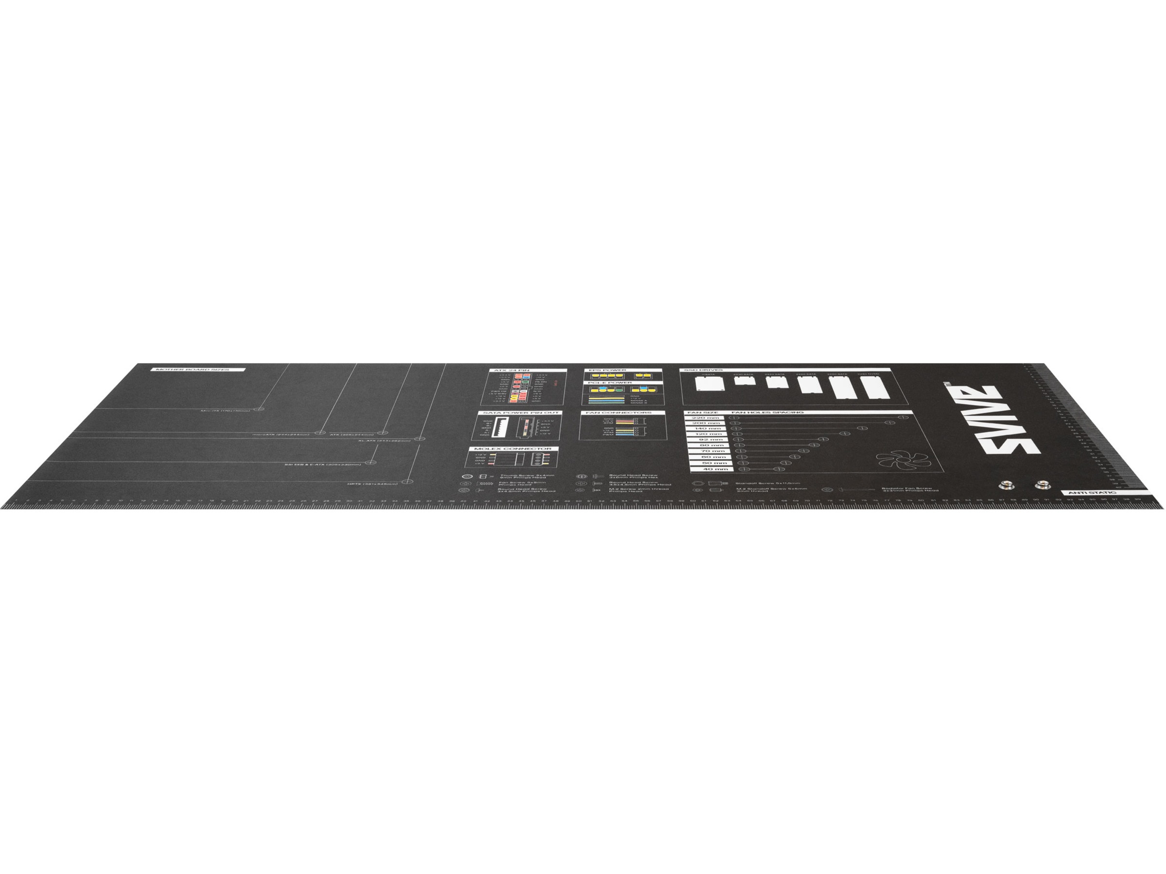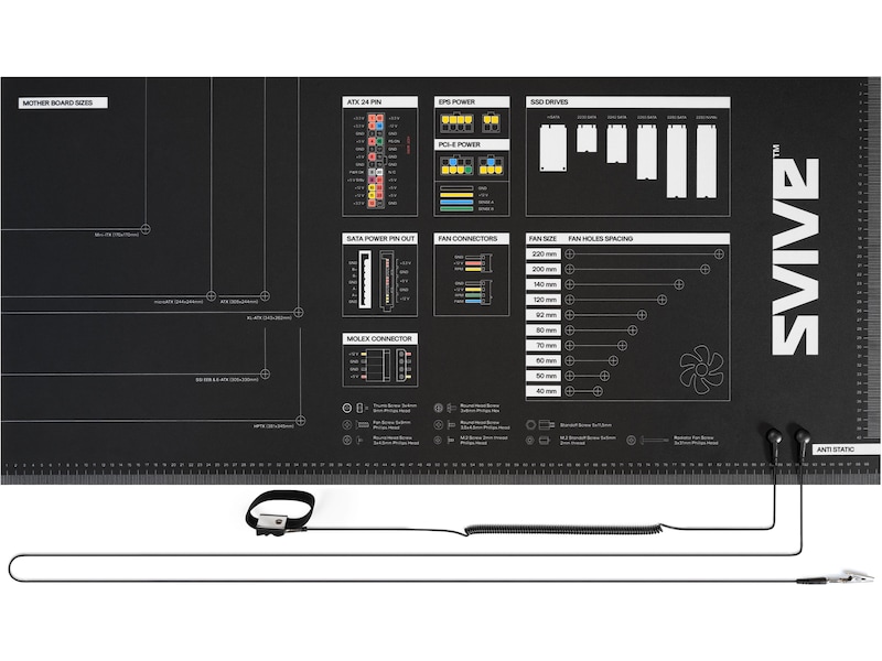 Overflaten på Svive Mod-Mat er fullpakket med nyttig informasjon som gjør det enklere og raskere å bygge PC-er. Den er merket med mange dimensjoner for viktige PC-komponenter, slik som hovedkort, vifter og SSD-er samt skruetyper og skruestørrelser.