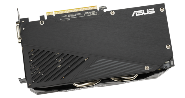 GeForce RTX 2060 DUAL EVOs tettpakkede kretskort er forsterket av en bakplate i aluminium som gir en stivere konstruksjon, noe som bidrar til å hindre at kretskortet bøyes og beskytter komponenter og sporveier mot skade.