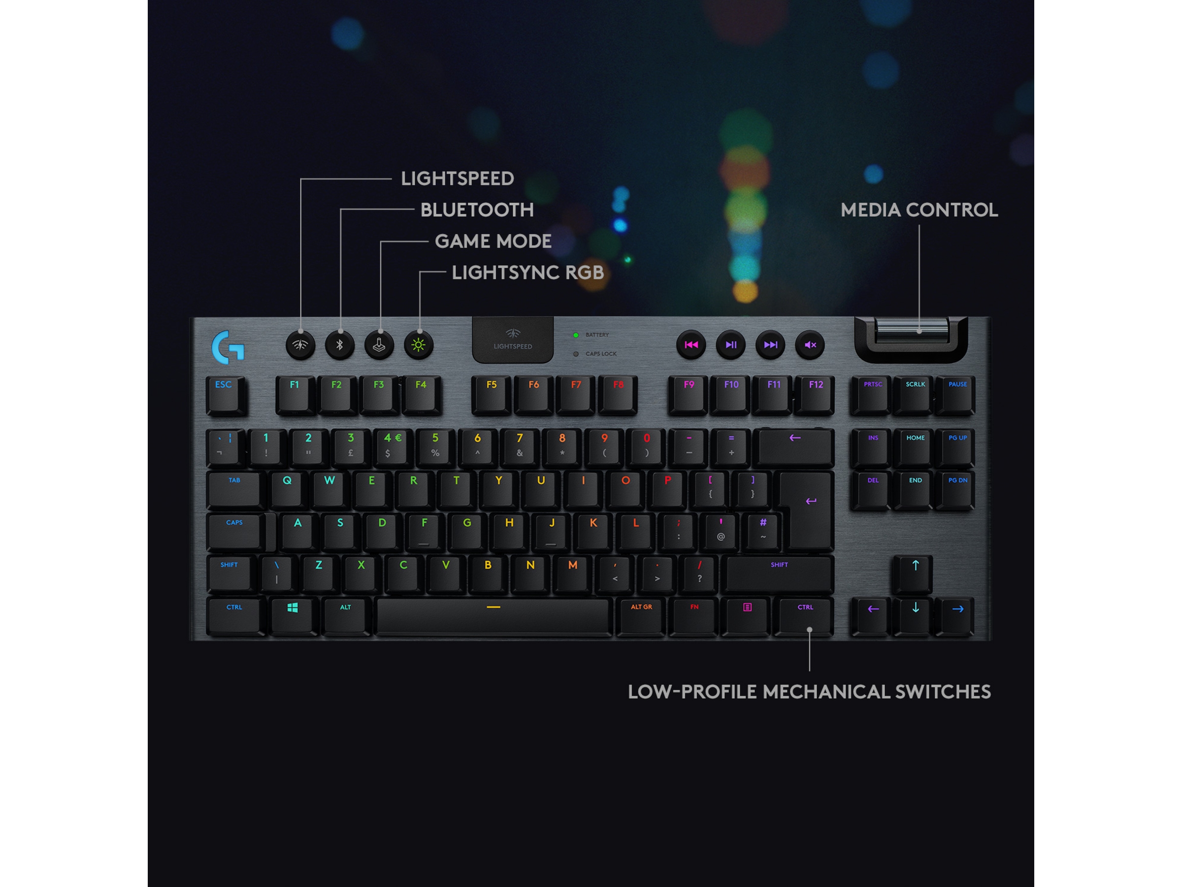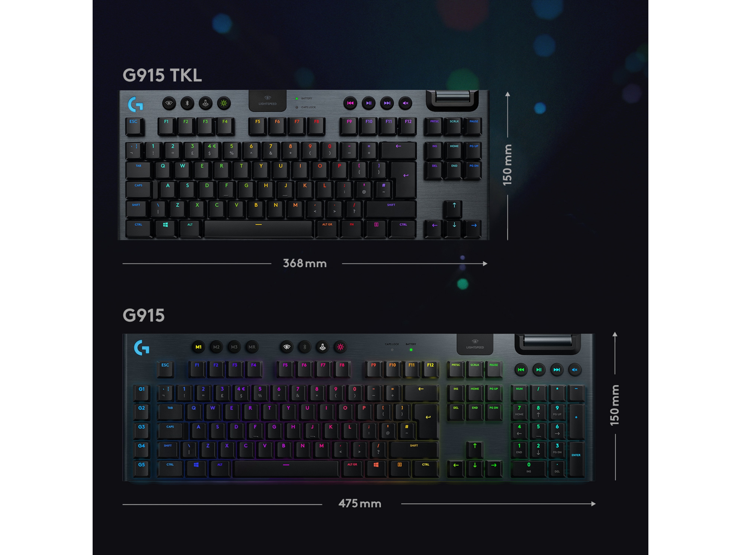 G915 tilhører en ny klasse av trådløse mekaniske spilltastaturer som kommer med 3 valg av lavprofils GL- brytere og 1 ms trådløs LIGHTSPEED- teknologi i proffklasse. Det kan levere 40 timers uavbrutt spilling på full lading. Alle tastene er fullt tilpassbare og med avansert LIGHTSYNC RGB teknologi kan du synkronisere belysningen med ethvert innhold.