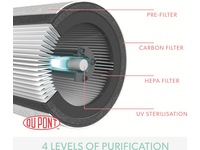 360 graders HEPA-filter fanger opp 99,97 partikler ned til 0,3 mikron og et kullfilter fjerner VOC-gasser/lukt fra alle retninger. UV-C lampen inni maskinen dreper virus og bakterier som kan bli fanget i filteret.