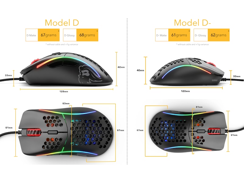 Form og størrelse er viktig når du velger mus. Nedenfor er målene til Model D-